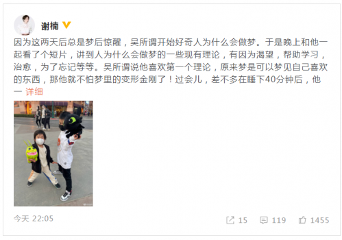 2022/04/21谢楠晒俩儿子合照4月11日,谢楠微博分享与儿子吴所谓的生活日常,称吴所谓开始好奇人为什么会做梦,自己和他一...