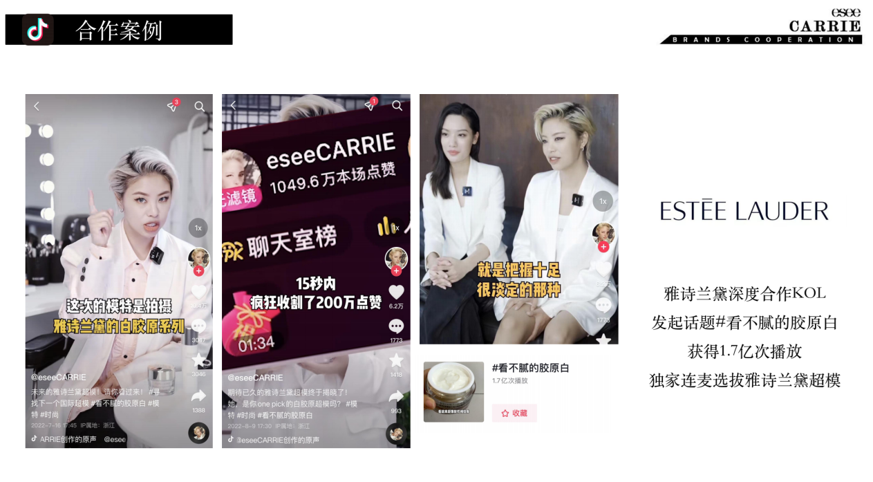 eseeCARRIE,上海人,esee英模文化创始人、微博故事红人、抖音时尚类头部KOL,全自媒体平台发展博主,全自媒体平台粉丝已...