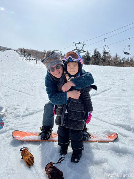 4月14日,陈冠希在微博晒出和女儿Alaia的合照,写道:“美好一天。”二人现身滑雪场,穿着厚实保暖。陈冠希将女儿搂在怀里,Alaia笑眼眯眯,很是可爱。