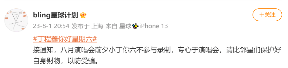 月1日,丁程鑫粉丝在社交平台发文透露,丁程鑫将暂停《你好星期六》节目录制,专心准备八月演唱会,“接通知,八月演唱会前夕小丁你六不参与录制,专心于演唱会,请比邻星们保护好自身财物,以防受骗。”