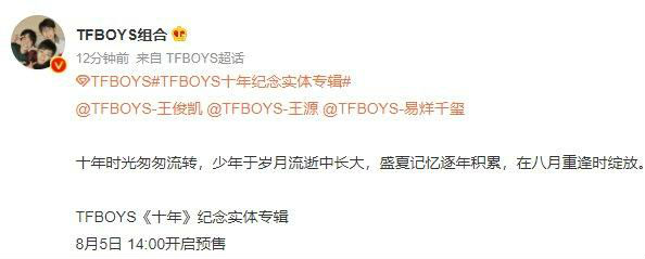 TFBOYS组合官方微博发布TFBOYS-王俊凯、TFBOYS-王源、TFBOYS-易烊千玺《十年》纪念实体专辑预告,8月5日 14:00开启预售。